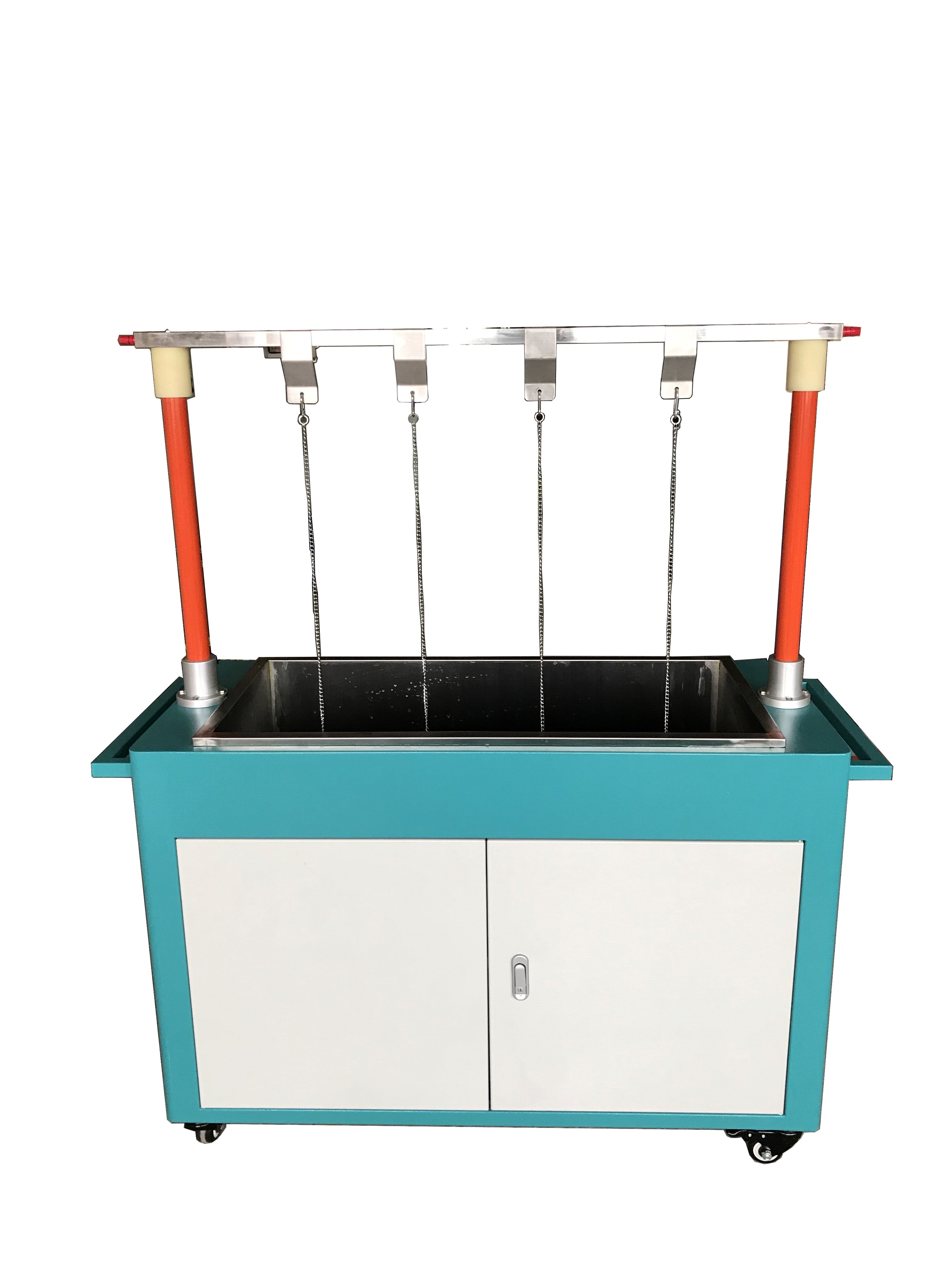 Reke02引流線試驗(yàn)裝置是根據(jù)(10V帶電作業(yè)的工器具預(yù)防性試驗(yàn)標(biāo)準(zhǔn))為依據(jù)研制而成。本裝置采用不銹鋼水槽,可同時(shí)進(jìn)行2組引流線(載流線)進(jìn)行耐壓試驗(yàn)。