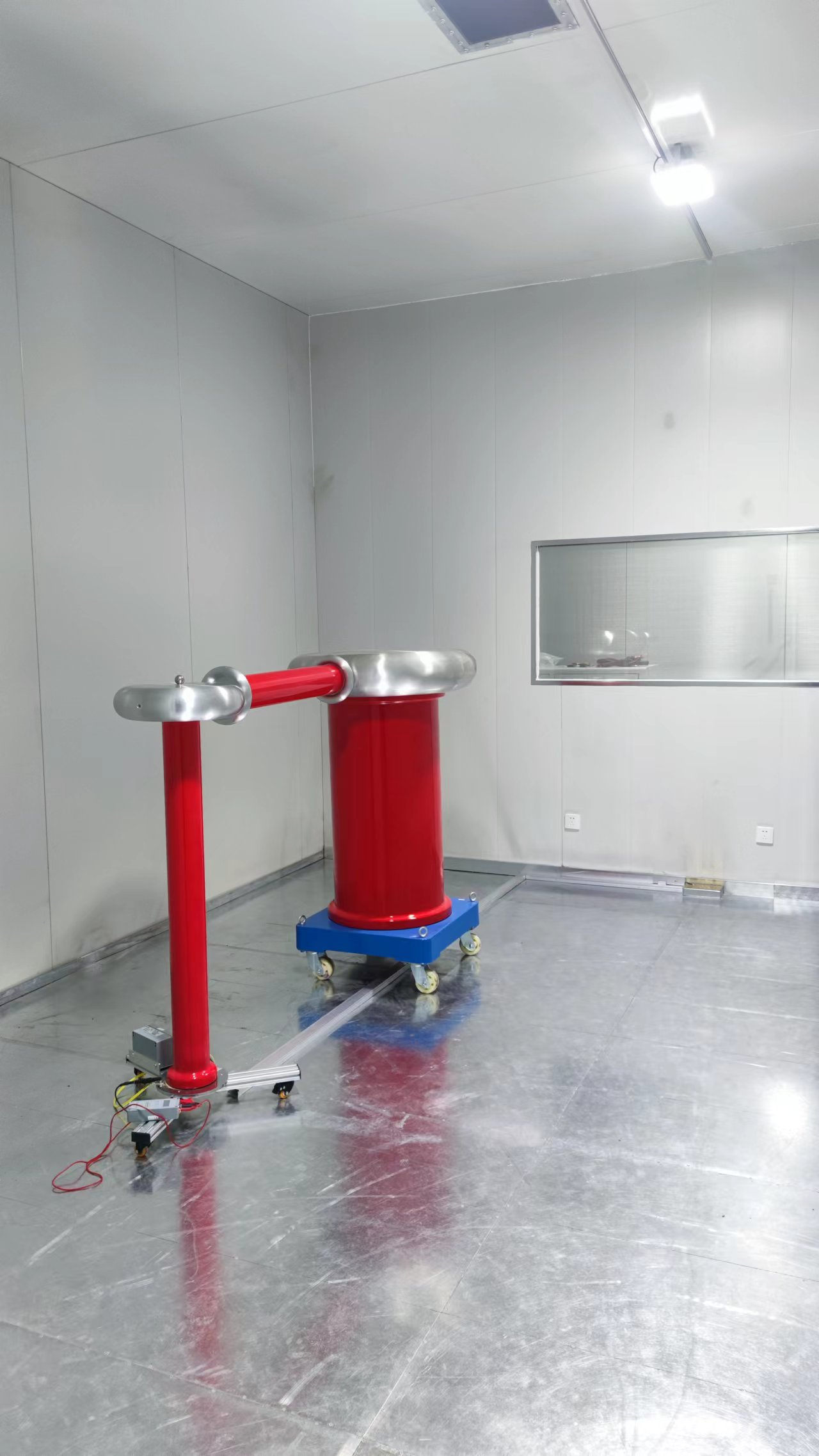 絕緣地坪采用5mmPP絕緣板焊接組成的隔離層,絕緣地坪尺寸:長7.5米×寬5.5米,試驗區(qū)域與外界的絕緣電阻要求10kΩ以上,確保整個試驗系統(tǒng)與車間沒有任何電氣連接,防止生產(chǎn)車間中其他電氣設(shè)備的干擾信號通過靜電耦合的方式傳導(dǎo)到試驗區(qū)域的地表或地下的金屬件(如鋼筋等),最終通過地線傳入到測試回路中。